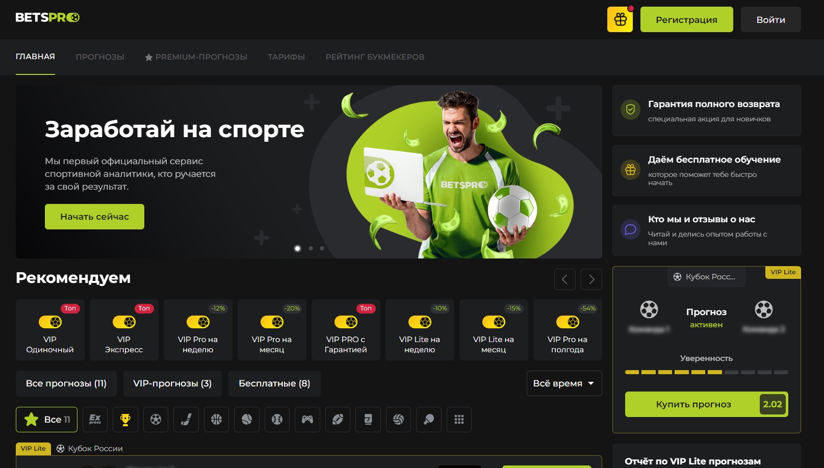 BETS-PRO (bets-pro.ru) — один из старейших проектов в рунете, специализирующихся на спортивных прогнозах. Сервис стабильно работает с 2021 года и за это время заслужил репутацию открытого и честного аналитического центра. В отличие от многих закрытых или сомнительных проектов, команда BETS-PRO делает ставку на прозрачность: аналитики по разным видам спорта (футбол, хоккей, баскетбол, теннис, волейбол, MMA, бейсбол и другие) ежедневно публикуют бесплатные прогнозы с разбором и высокими коэффициентами.