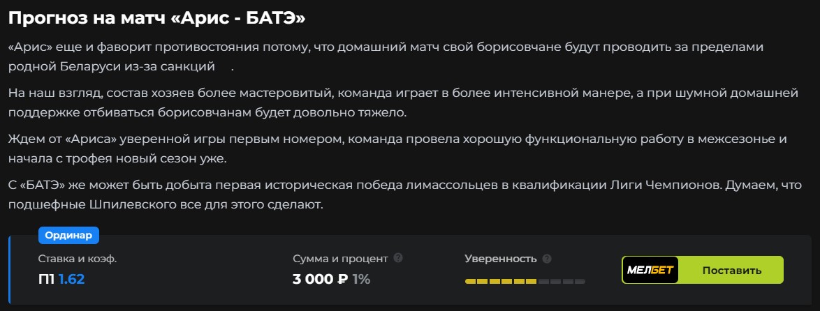 Ежедневно в ленте сайта и Telegram публикуется несколько бесплатных ставок. Это отличная возможность проверить качество аналитики без финансовых рисков. Примечательно, что проходимость бесплатных прогнозов держится на хорошем уровне — редкое качество для подобных сервисов.