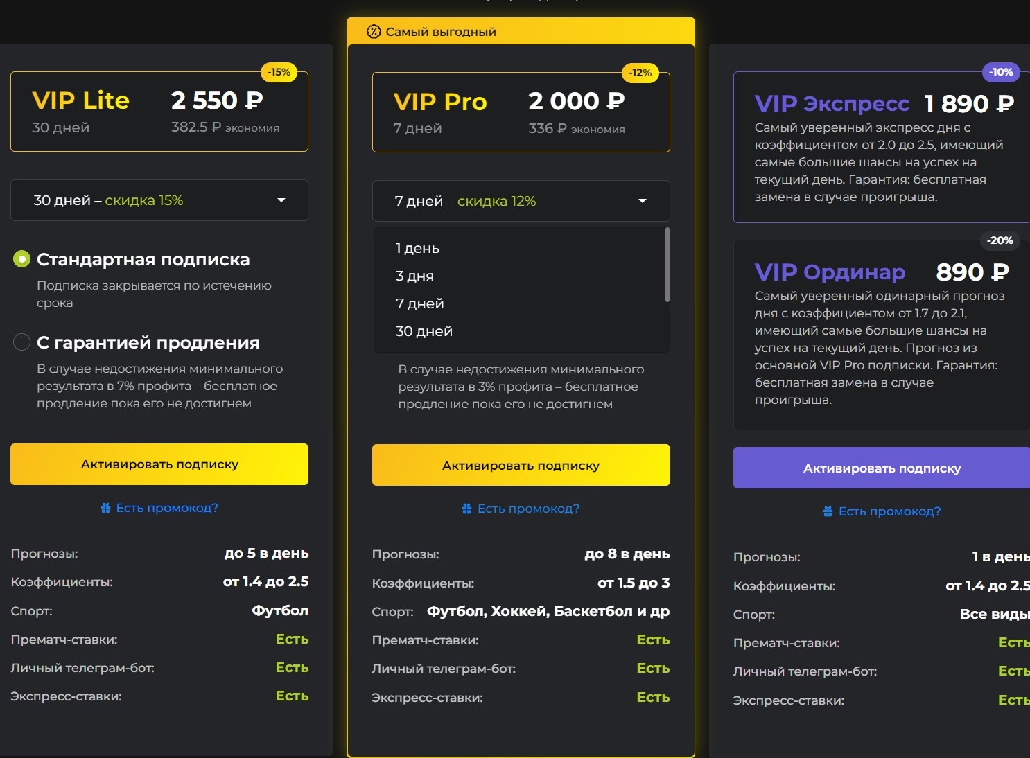 Цены вполне доступные: за месяц подписки выходит 85–160 ₽ в день за несколько ставок. Это подходит даже для игроков с небольшим банком.