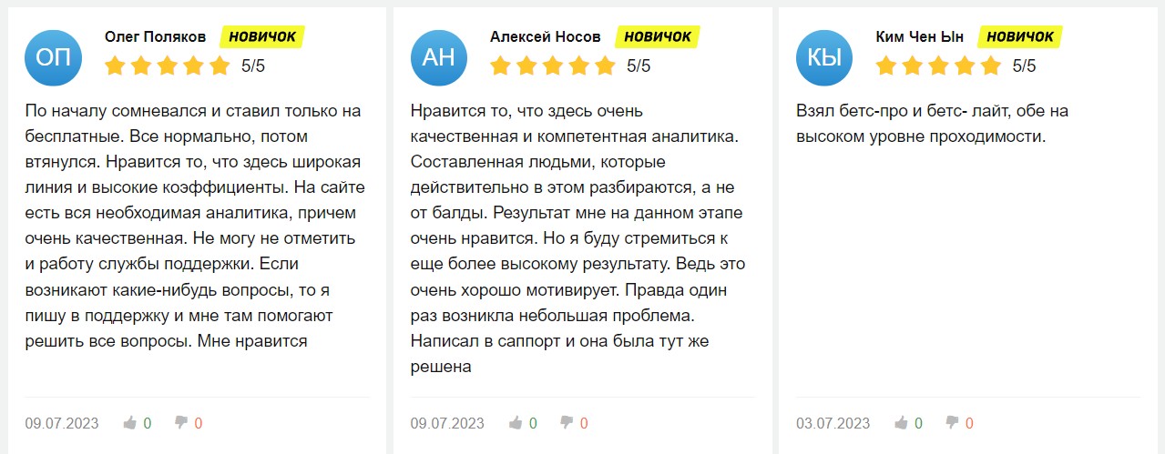 На сайте преобладают положительные комментарии от клиентов. На независимых ресурсах мнения в основном хорошие: пользователи хвалят честную статистику, бесплатные прогнозы, гарантию продления, стабильность и нахождение в белых списках (более 95% положительных обзоров).