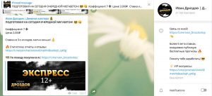 реклама букмекера с сомнительной репутацией — каппер зарабатывает 40% от проигрышей подписчиков;