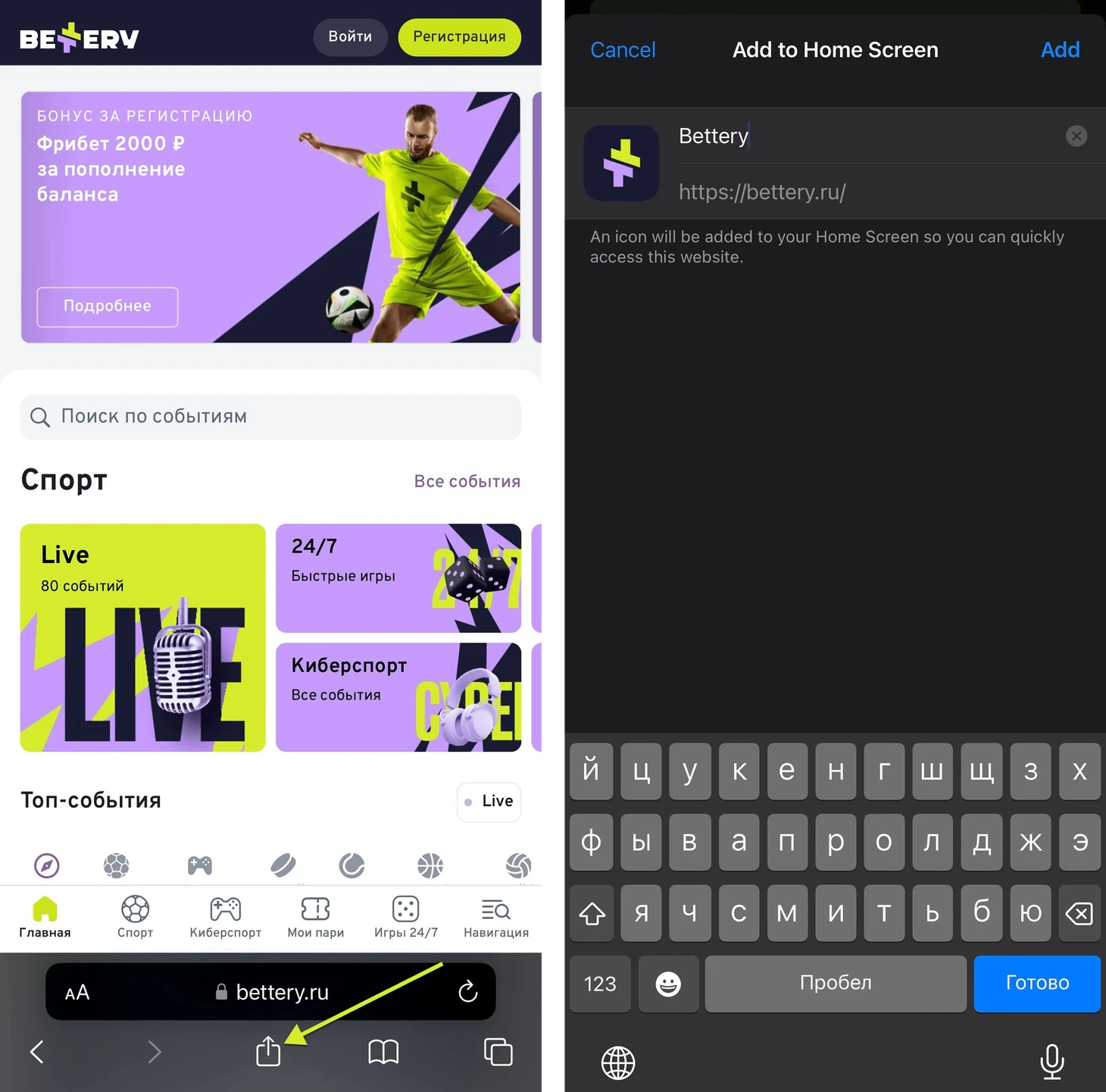 PWA Bettery для iOS — это быстрый, легкий и удобный способ ставить на спорт. Добавьте ярлык за 30 секунд, зарегистрируйтесь и получите 2000 рублей фрибетами. Просто, быстро и выгодно!