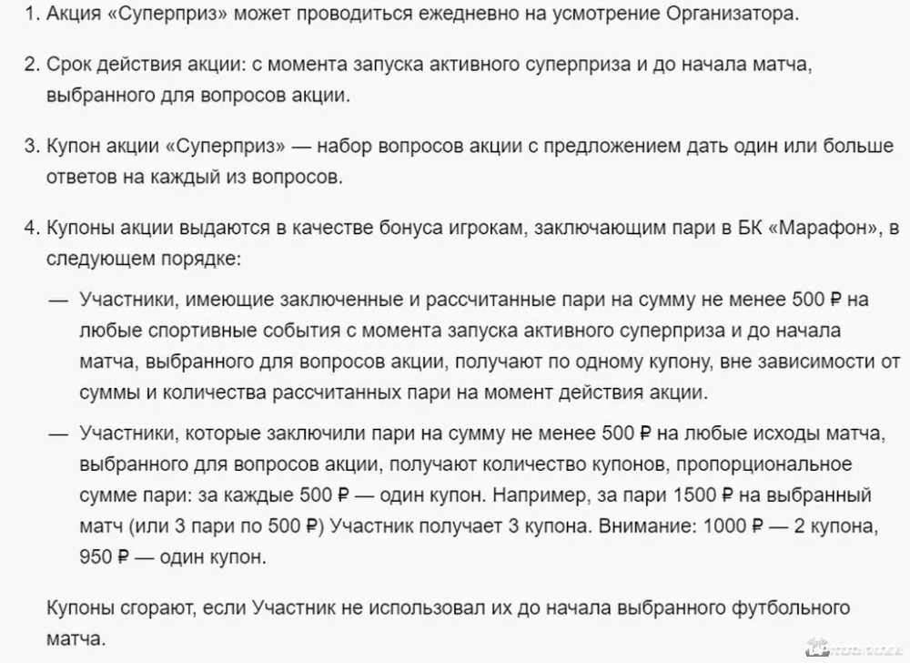 Букмекерская контора «Марафон» проводит акцию для действующих клиентов, в рамках которой участники могут получить бонус до 500 000 рублей за точные прогнозы на исходы предложенного матча дня. Для участия необходимо зарабатывать купоны за ставки на спорт, а затем оставлять прогнозы на 11–12 статистических показателей матча. Приз начисляется без отыгрыша.