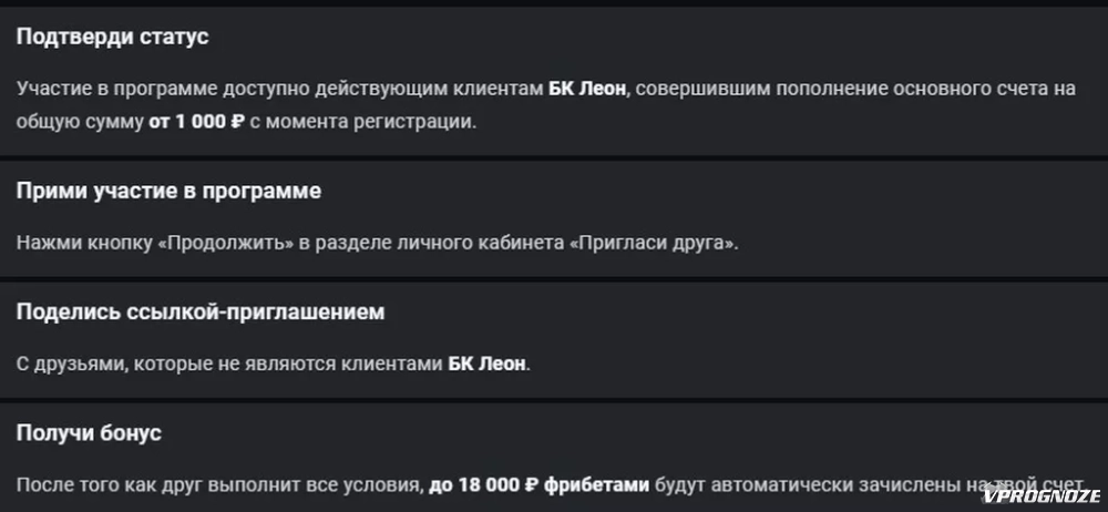 Букмекерская контора «Leon» предлагает действующим и новым клиентам зарабатывать фрибеты за приглашение друзей. Максимальная сумма бонуса — 18 000 рублей. Для получения необходимо пригласить незарегистрированного пользователя по реферальной ссылке. Новый игрок должен зарегистрироваться, пройти идентификацию, внести депозит от 3000 рублей и сделать ставку. Бонус начисляется обоим участникам.