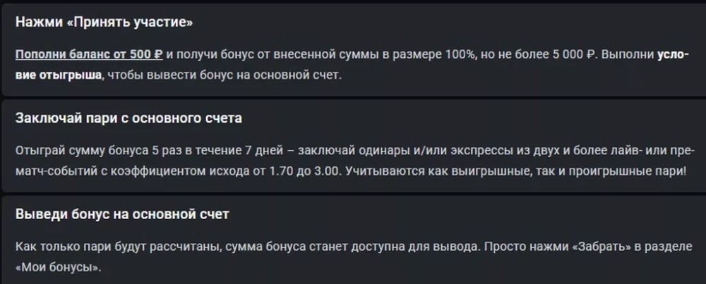• Отыграть бонус с вейджером х5 ставками (ординары или экспрессы) с коэффициентом от 1.70 до 3.00 в течение 7 дней.