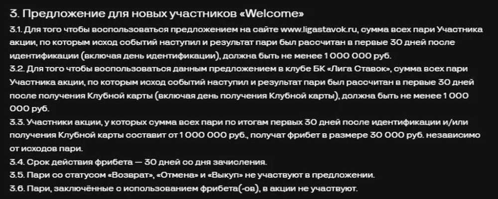 Букмекерская компания «Лига Ставок» предлагает новым клиентам крупный приветственный бонус — фрибет на 30 000 рублей. Для получения бонуса необходимо зарегистрироваться с промокодом, пройти идентификацию, внести депозит и сделать ставки на общую сумму от 1 миллиона рублей в течение первого месяца.