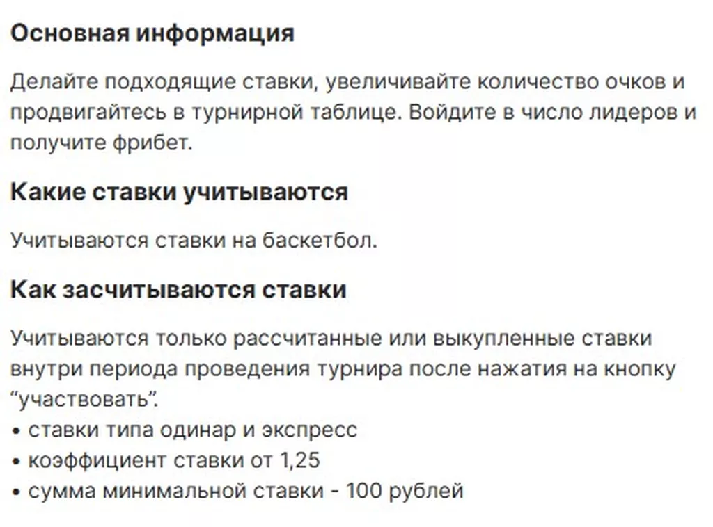 Важно: участие в турнире предполагает соревнование с другими игроками, и для попадания в топ-250 могут потребоваться значительные обороты, особенно в периоды высокой активности (плей-офф НБА, Евролига, топ-матчи). Рекомендуется участвовать, если вы планируете активно ставить на баскетбол в период проведения конкурса.