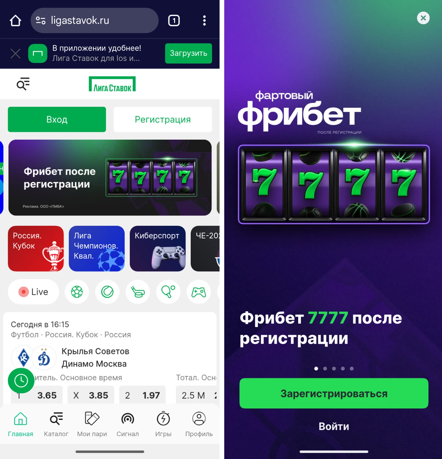 Официальный сайт ligastavok.ru (мобильная версия автоматически предлагает кнопку «Скачать приложение»)