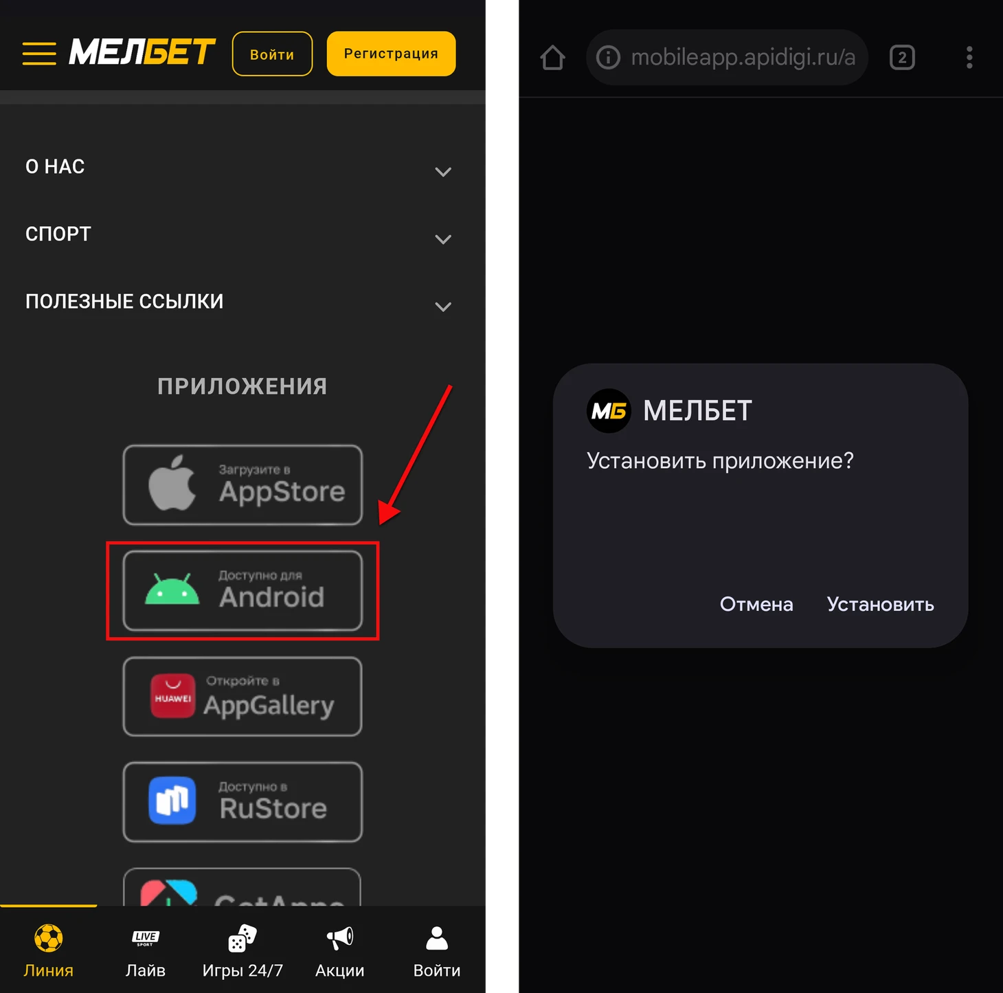 Официальный сайт melbet.ru (мобильная версия автоматически предлагает кнопку «Скачать приложение»)