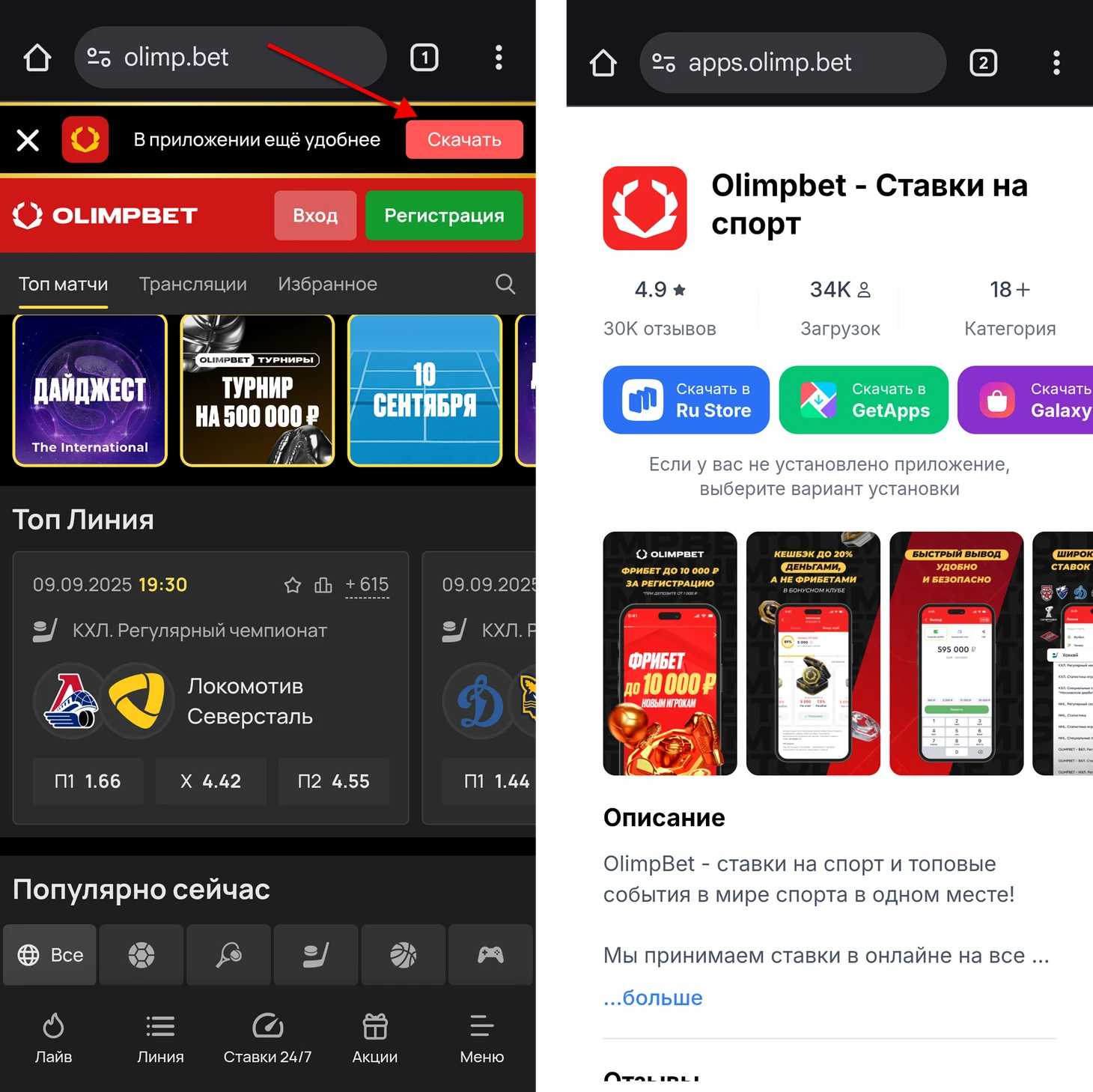 Официальный сайт olimpbet.ru (мобильная версия автоматически предлагает кнопку «Скачать приложение»)