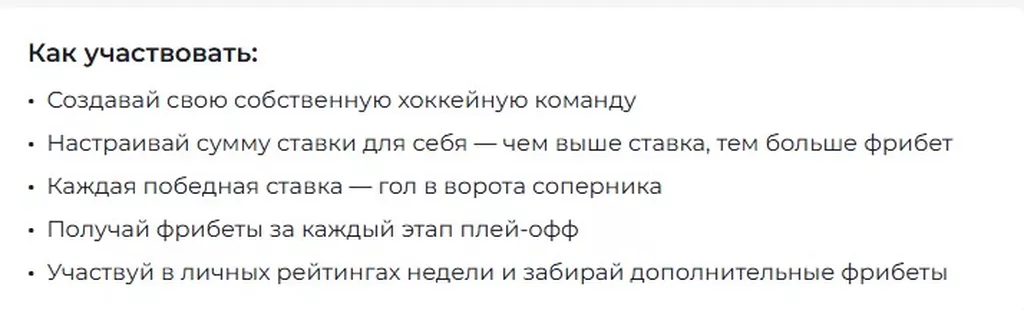 Для фанатов хоккея БК «Пари» приготовила действительно увлекательную акцию. На каждом этапе (после прохождения каждой лиги) пользователь гарантированно зарабатывает фрибет. Главное преимущество — вы сами выбираете уровень сложности, а значит, можете контролировать размер минимальной ставки и потенциального бонуса. Рекомендуется участвовать тем, кто регулярно ставит на хоккей и хочет получать дополнительные бесплатные ставки за свою активность.