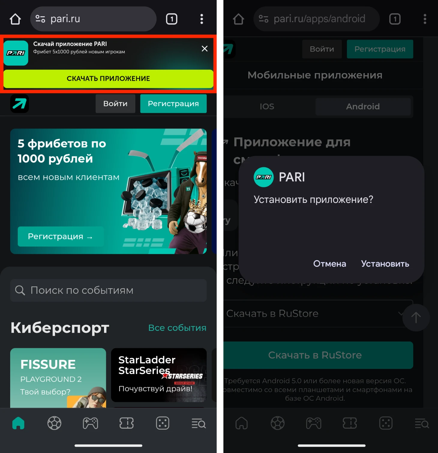 Официальный сайт pari.ru (мобильная версия автоматически предлагает кнопку «Скачать приложение»)