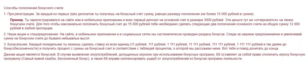 • Несколько источников пополнения бонусного счета: приветственные депозиты, понедельничные ставки, депозиты через СБП, периодические акции.