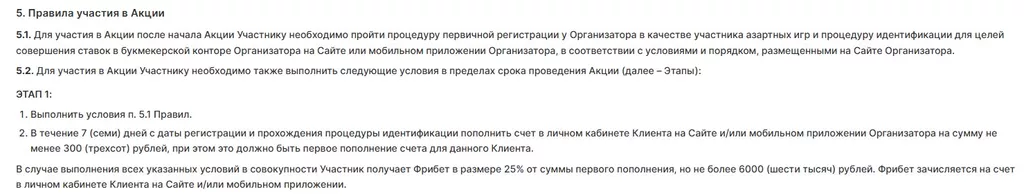 Для участия необходимо зарегистрироваться с промокодом, пройти идентификацию и внести депозит от 300 рублей в течение 7 дней. Ставки для второго фрибета должны быть с коэффициентом от 1.30. Фрибеты действуют 7 дней, используются на ординары или экспрессы с коэффициентом от 1.30 до 3.50, а выигрыш зачисляется в виде чистой прибыли без отыгрыша. Вывод средств возможен на ранее использованный платежный инструмент. Акция позволяет новым игрокам получить до 18 000 рублей бесплатными ставками за депозит и активность.