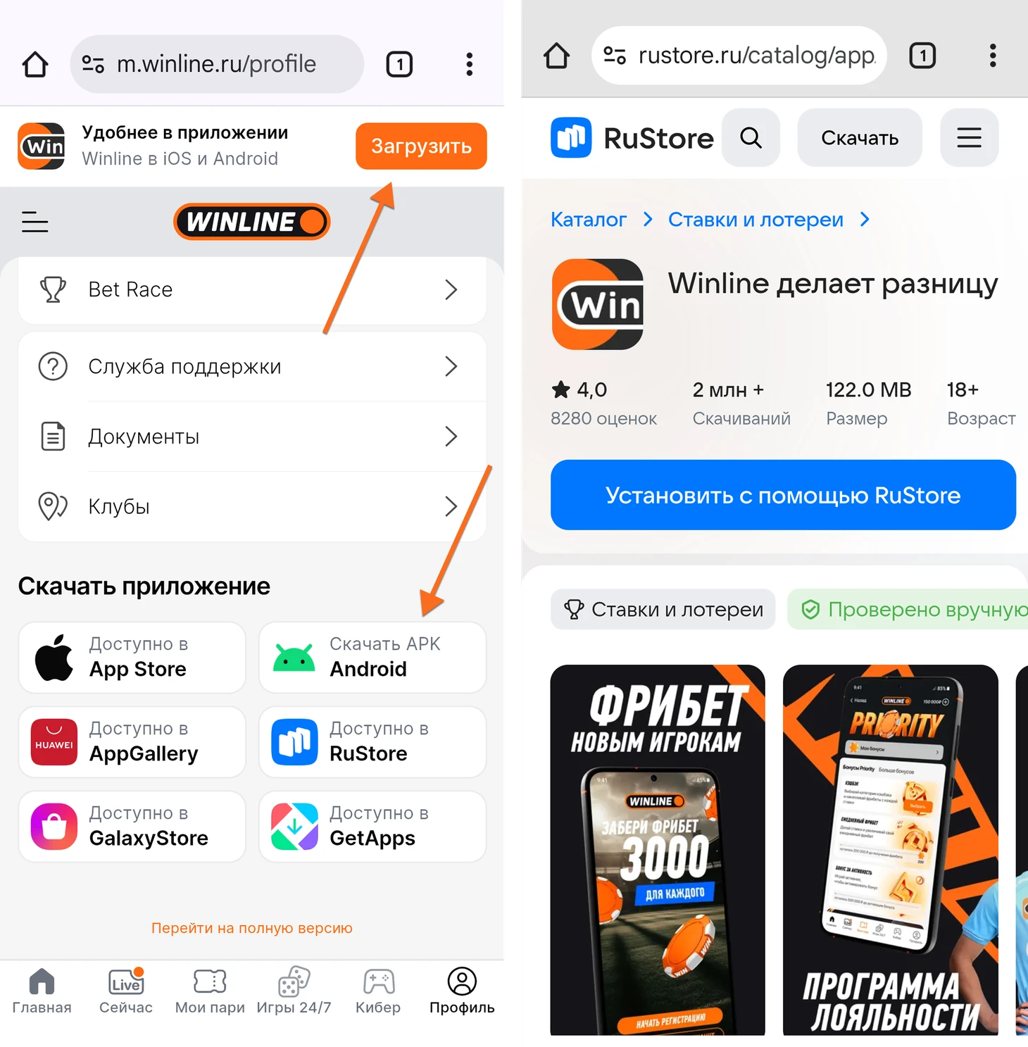 Скачать приложение проще всего прямо с официального сайта winline.ru — мобильная версия автоматически предложит это сделать при входе со смартфона или планшета (адрес мобильной версии: m.winline.ru).