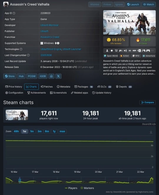 Assassin’s Creed Valhalla, вышедшая в 2020 году, продолжает удивлять. Спустя несколько лет после релиза игра достигла исторического максимума по количеству одновременных игроков в Steam, обойдя по этому показателю другие RPG-части серии — Origins и Odyssey.