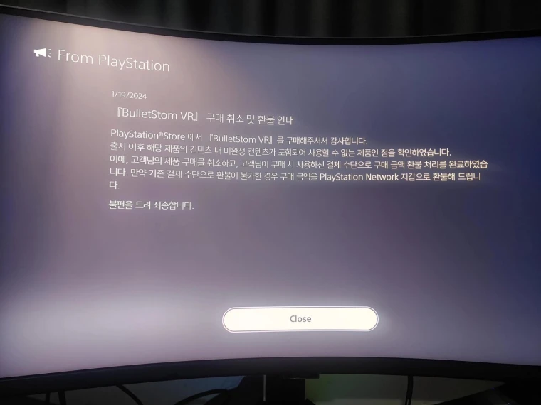 Согласно данным из Южной Кореи, игра исчезает из PlayStation Store, а всем покупателям автоматически возвращают деньги. На опубликованном скриншоте уведомления говорится, что Bulletstorm VR признан «продуктом, который невозможно использовать, содержащим незавершённый контент». Далее следует пояснение: покупка отменена, а средства возвращены тем же способом, которым производилась оплата.