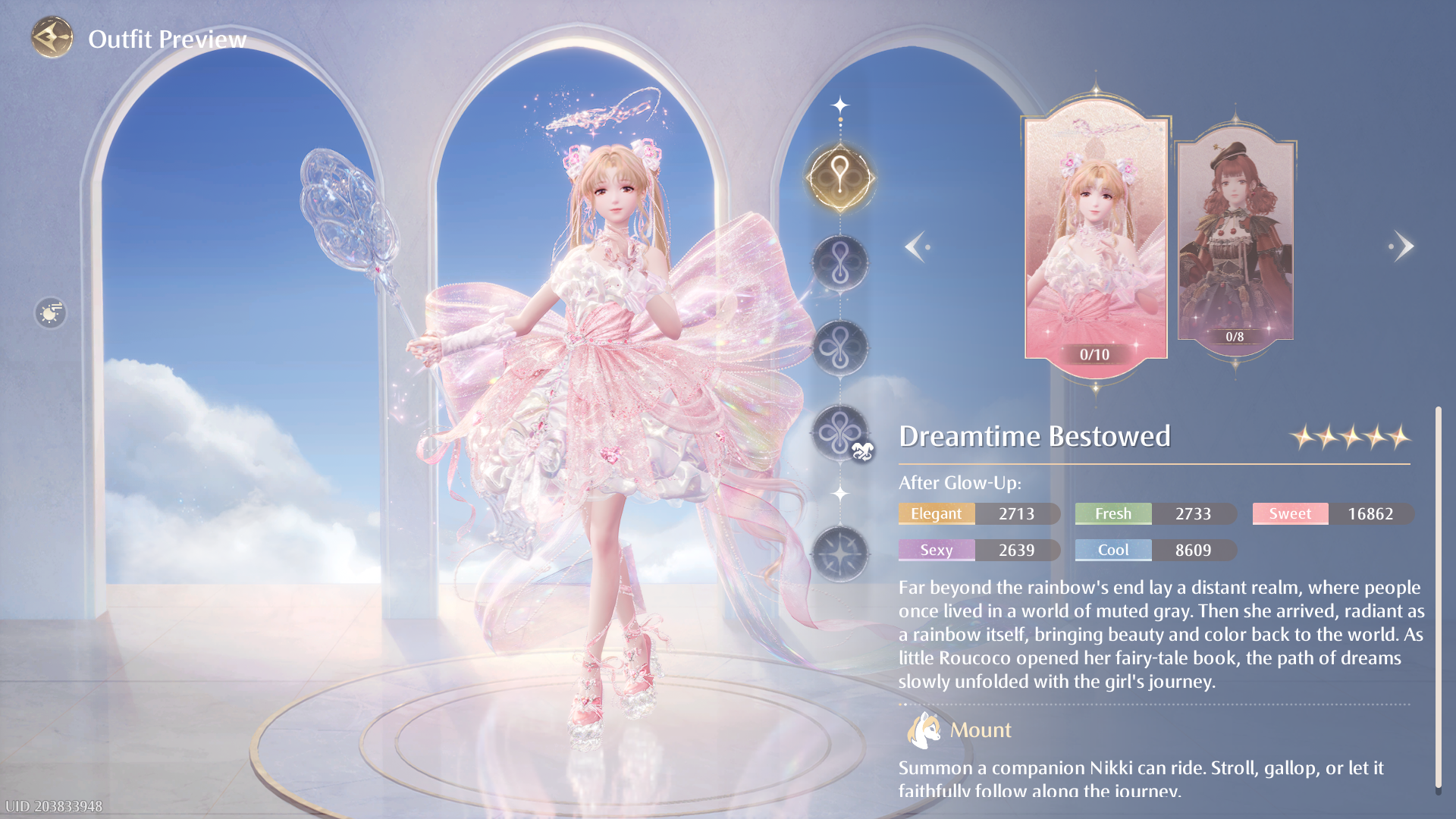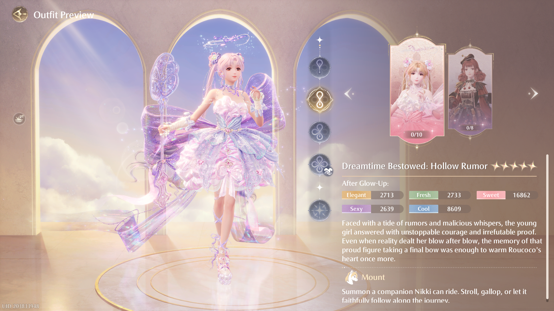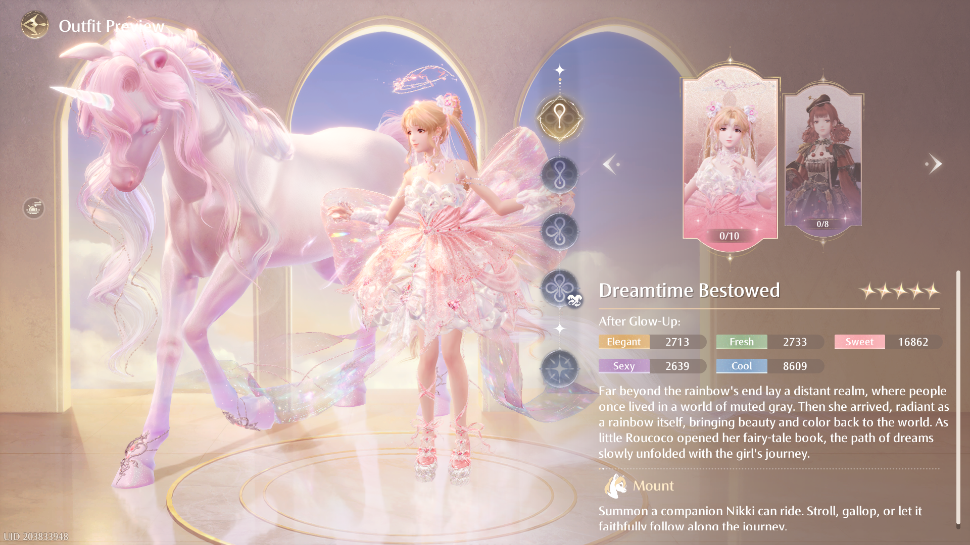 Это, безусловно, звезда версии 2.3 — очаровательный наряд в конфетно-сладком стиле, относящийся к категории Sweet (Милота) . Его главная фишка — уникальная способность-транспорт «Клятва Единорога» (Unicorn’s Vow: Mount), которая позволяет Никки призвать волшебного единорога .