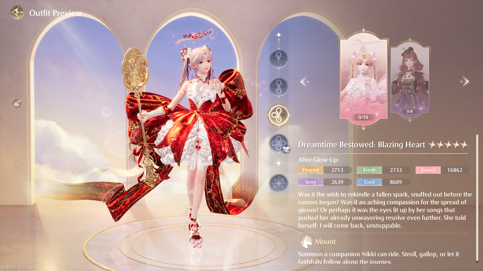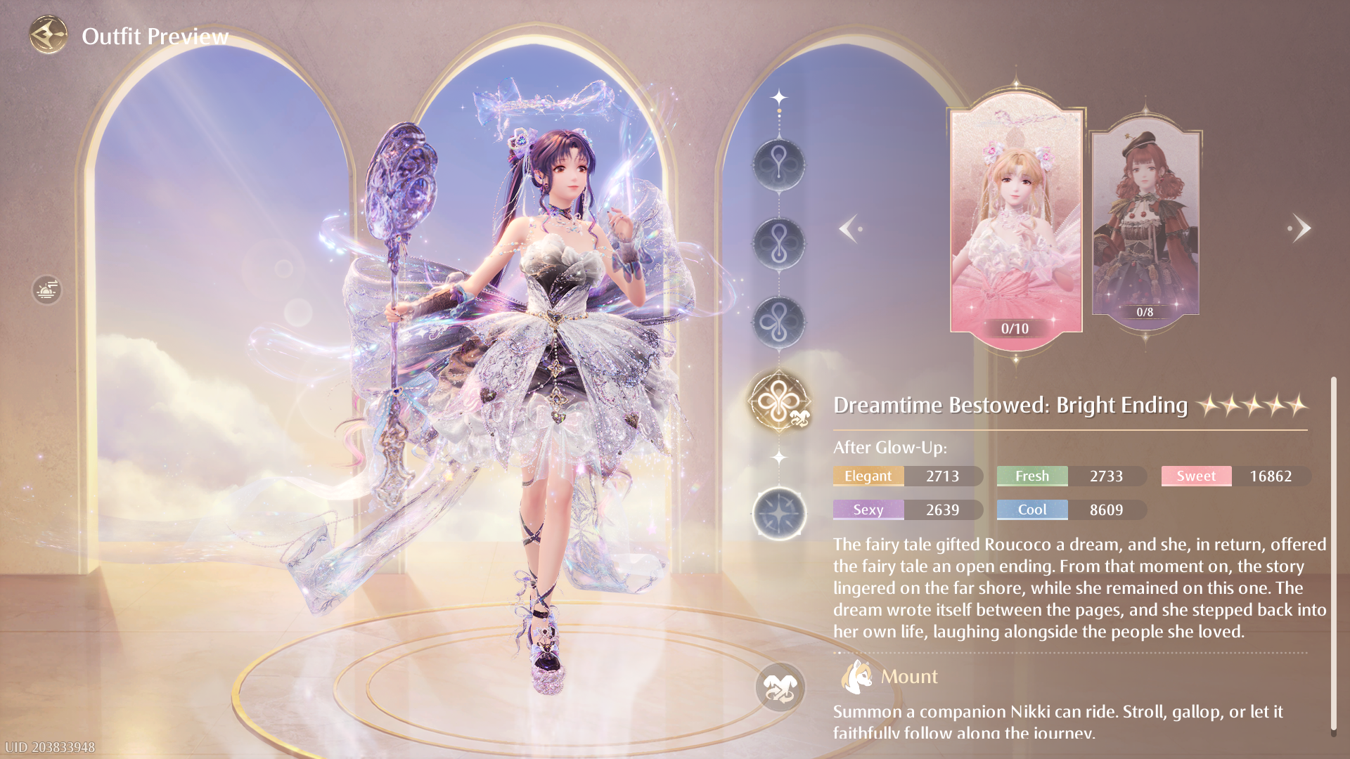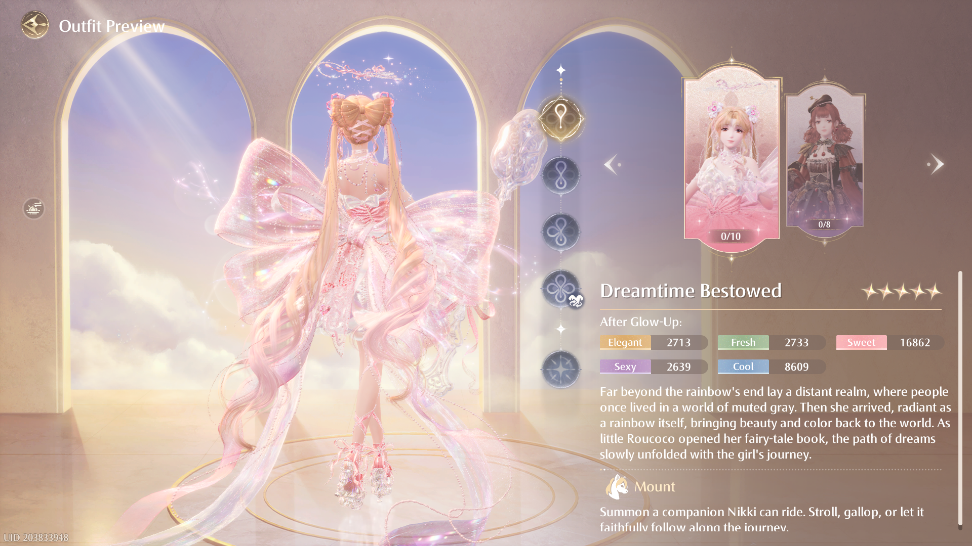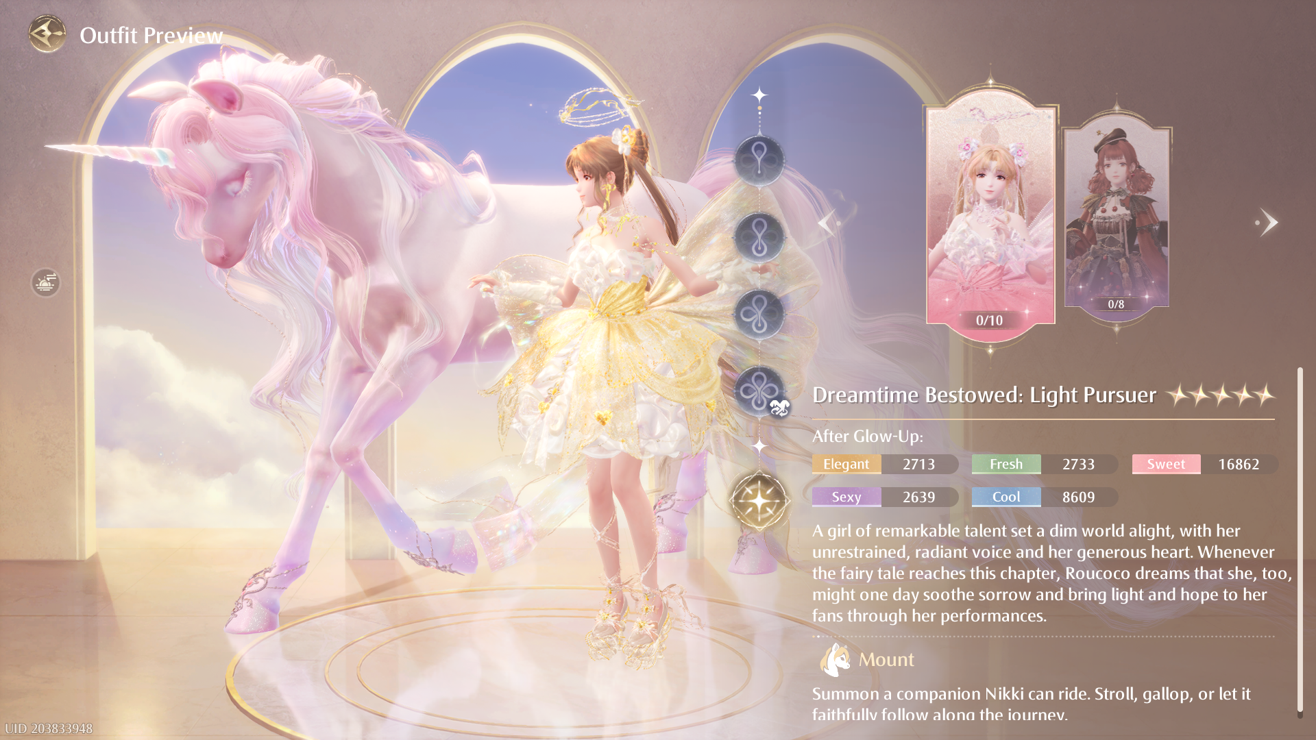 Это, безусловно, звезда версии 2.3 — очаровательный наряд в конфетно-сладком стиле, относящийся к категории Sweet (Милота) . Его главная фишка — уникальная способность-транспорт «Клятва Единорога» (Unicorn’s Vow: Mount), которая позволяет Никки призвать волшебного единорога .