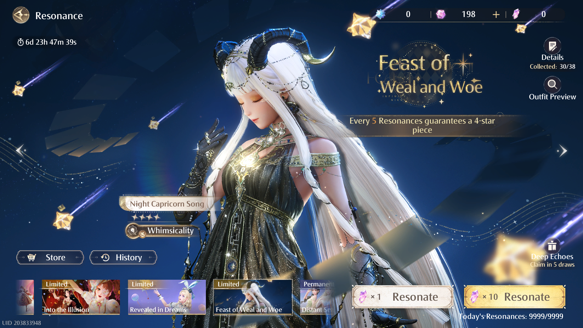 С 15 марта в игре стартовал дополнительный ивентовый баннер «Пиршество судьбы» (Feast of Weal and Woe), главной наградой которого является 4-звездочный набор Night Capricorn Song . Этот таинственный наряд в темных тонах обладает способностью каприза «Песнь оракула» (Oracle Card Whimsicality): при использовании Никки призывает парящие в воздухе карты таро, и выбор одной из них запускает красивую визуальную сцену с символическими предсказаниями .