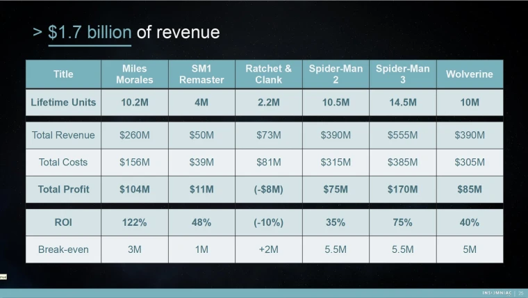 Для сравнения: Marvel’s Spider-Man Remastered продалась тиражом более 4 миллионов копий, принеся 11 миллионов долларов прибыли при бюджете 39 миллионов (ROI 48%). В утечке также фигурируют данные о Ratchet and Rift Apart, а также прогнозы по Spider-Man 3 и Wolverine.