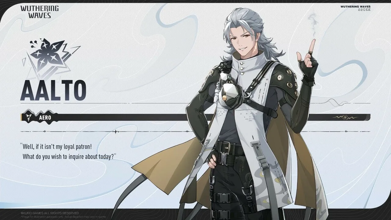 Аалто (Aalto) в Wuthering Waves — загадочный 4* брокер с обворожительной улыбкой и неуловимостью. Он использует пистолеты и элемент Aero, выступая гибридом: создаёт туманные врата для усиления выстрелов и телепортации в дымку. Приманки делают его неуловимым. Ключ — Аутро-скилл: +Aero-урон следующему (идеально для Цзияня или будущих Aero-ДД).