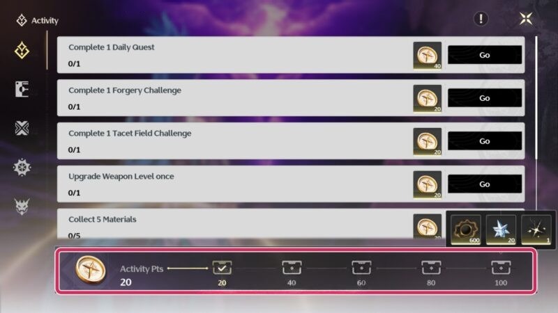 Из Книги заданий (Guidebook): простые задачи (собрать 5 материалов, скрафтить). 100 очков = 60 астритов + 2000 опыта.