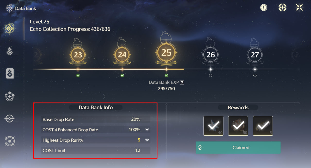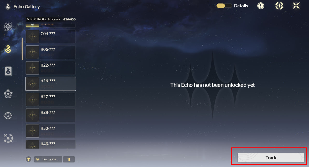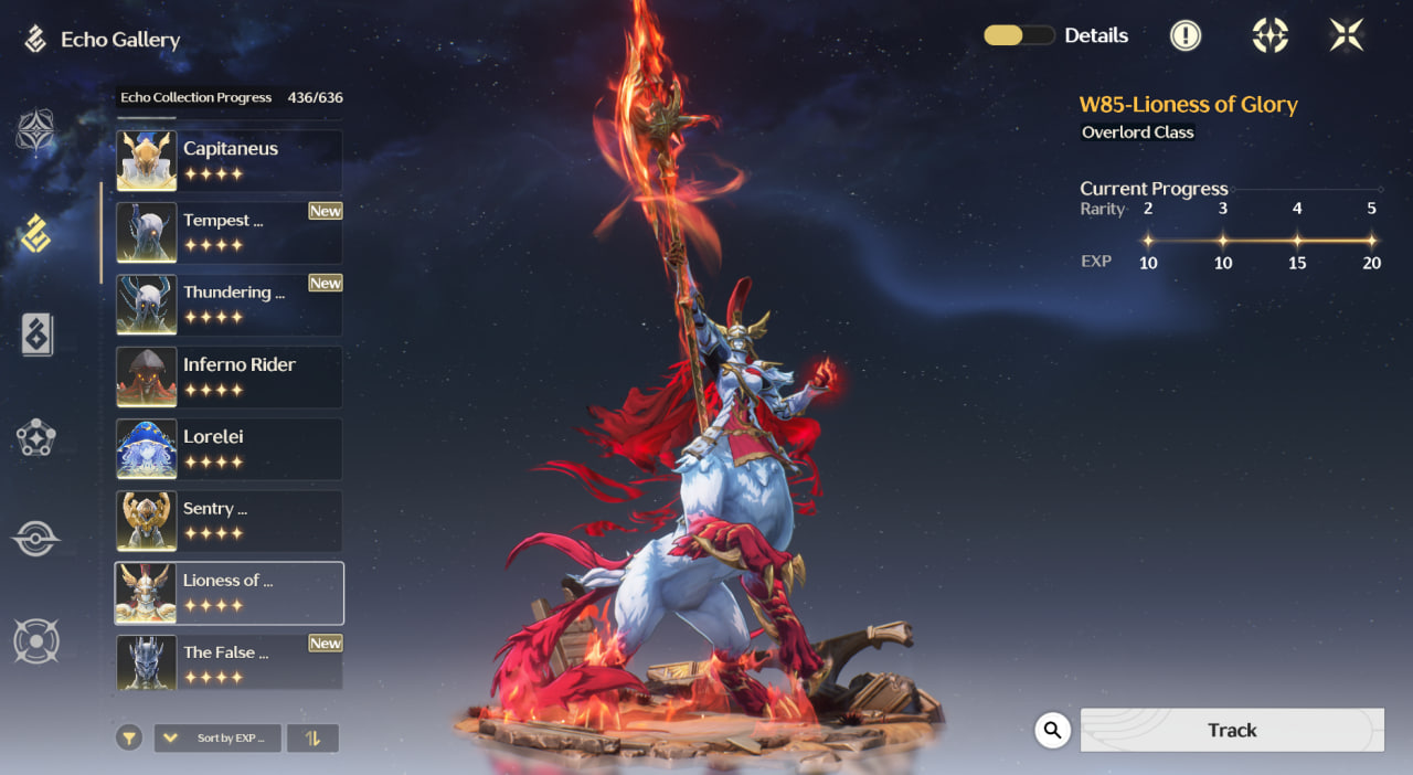 Прокачка идёт через Echo Collection Progress — заполнение галереи Эхо. В игре на данный момент 636 уникальных врагов, каждый с 5 уровнями редкости (1–5★). Опыт даётся только за новых монстров или высшие ранги той же стоимости.