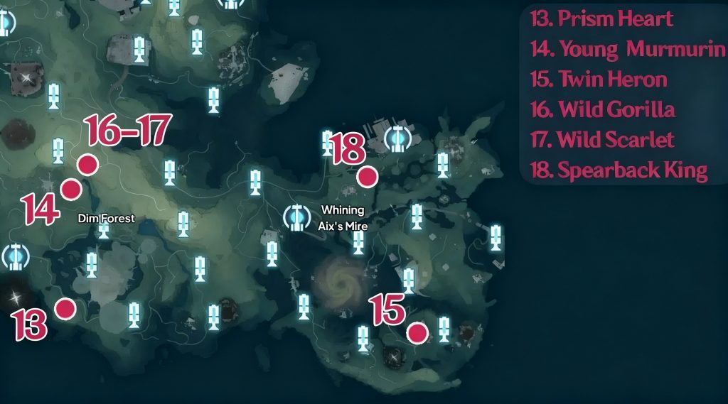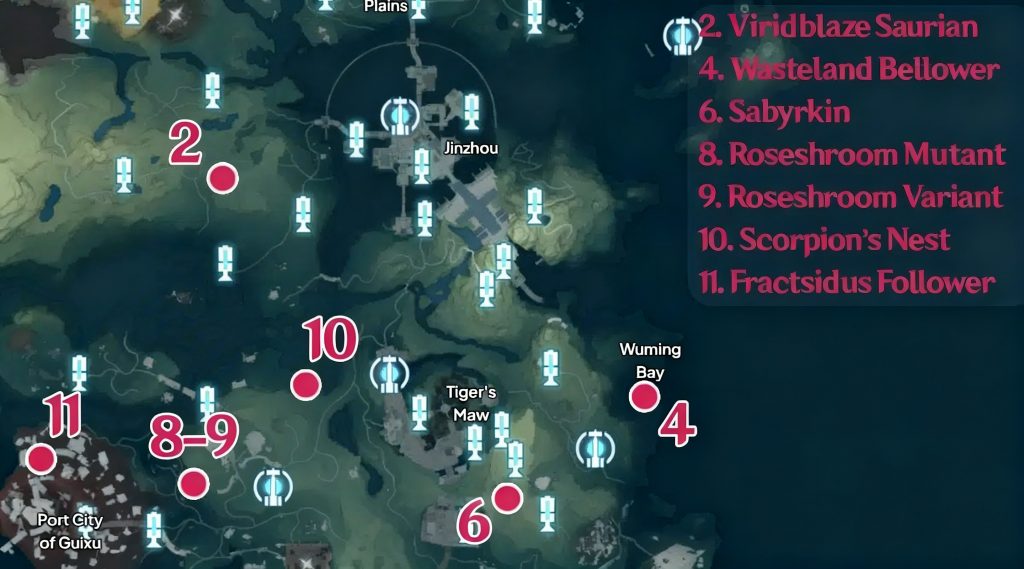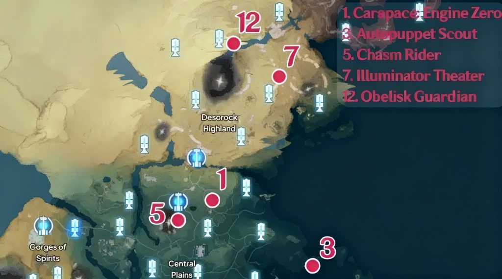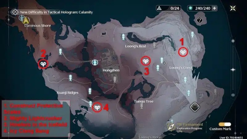 Все элитные мобы пронумерованы по уровню сложности. Карта разделена на северную, центральную и южную зоны Хуанлуна, плюс Гора Небесная Твердыня (Mt. Firmament).