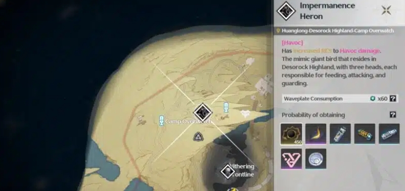 - Impermanence Heron — мировой босс, расположенный недалеко от Смотрового лагеря в Хуанлуне.