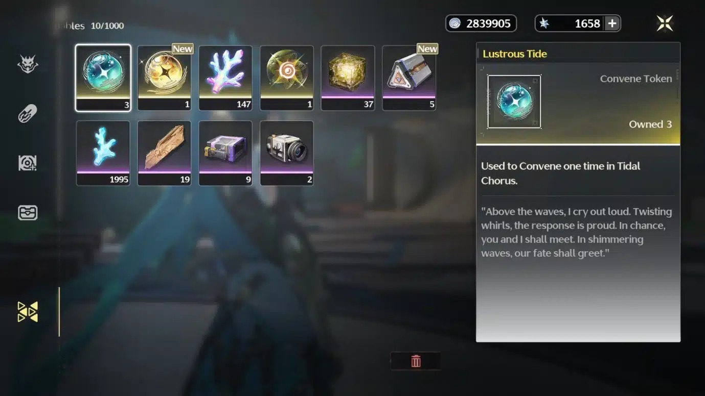 Альтернативно смотрите в «Backpack → Valuables»: здесь хранятся Астриты, синие стандартные крутки [Lustrous Tides] и жёлтые лимитированные [Radiant Tide] для покупок в баннерах.