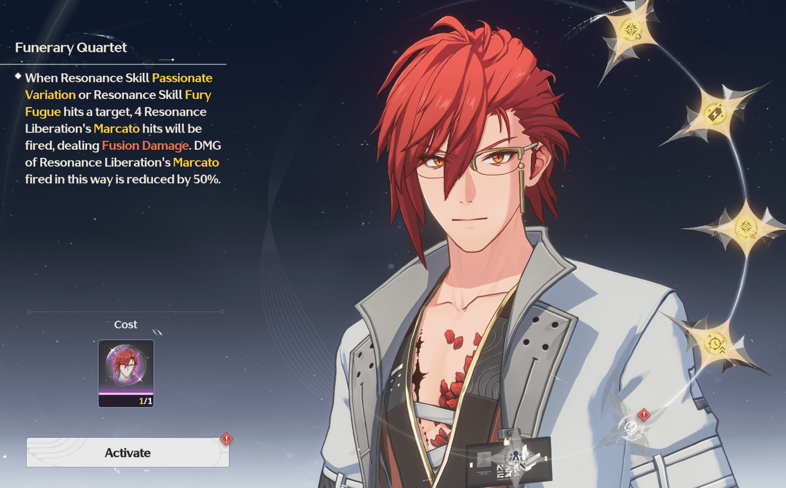 - Одиночный Этюд (Solitary Etude): в Горящей Рапсодии Навык активного = совместная +2 Маркато.