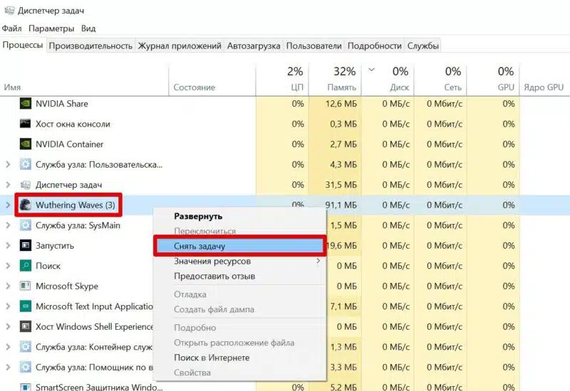 - Убедитесь, что Wuthering Waves полностью закрыта. Откройте Диспетчер задач (Ctrl + Shift + Esc), перейдите во вкладку «Процессы» и завершите все задачи, связанные с игрой (если они там есть) — кликните правой кнопкой → «Снять задачу».