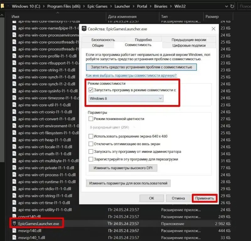 - Вернитесь к файлу EpicGamesLauncher.exe (по пути из пункта 3) → «Свойства» → «Совместимость».