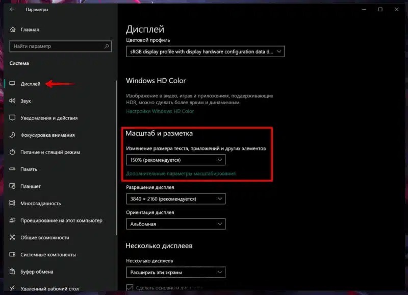 - Нажмите Пуск → «Параметры» → «Система» → «Дисплей».