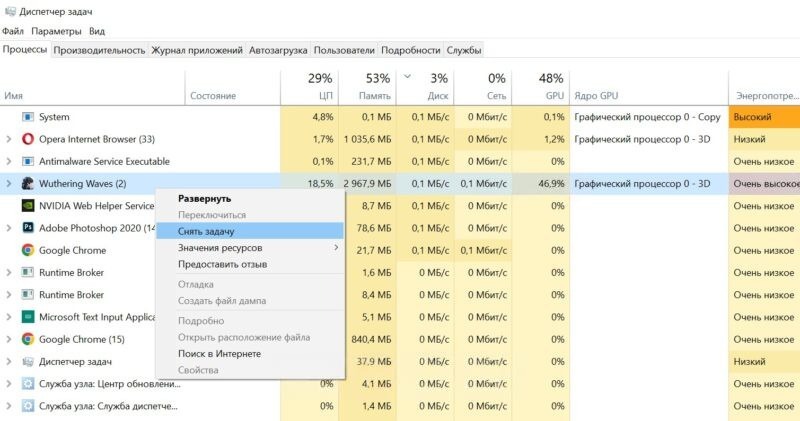 - Диспетчер задач → найдите Wuthering Waves (даже если не видно окна).