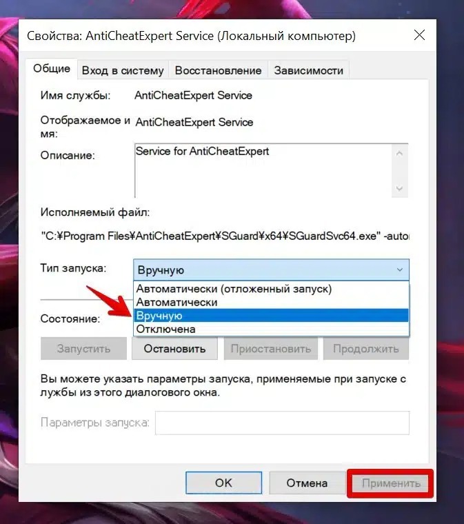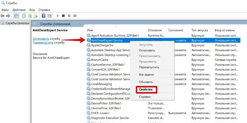 - Найдите AntiCheatExpert Service → ПКМ → «Свойства».