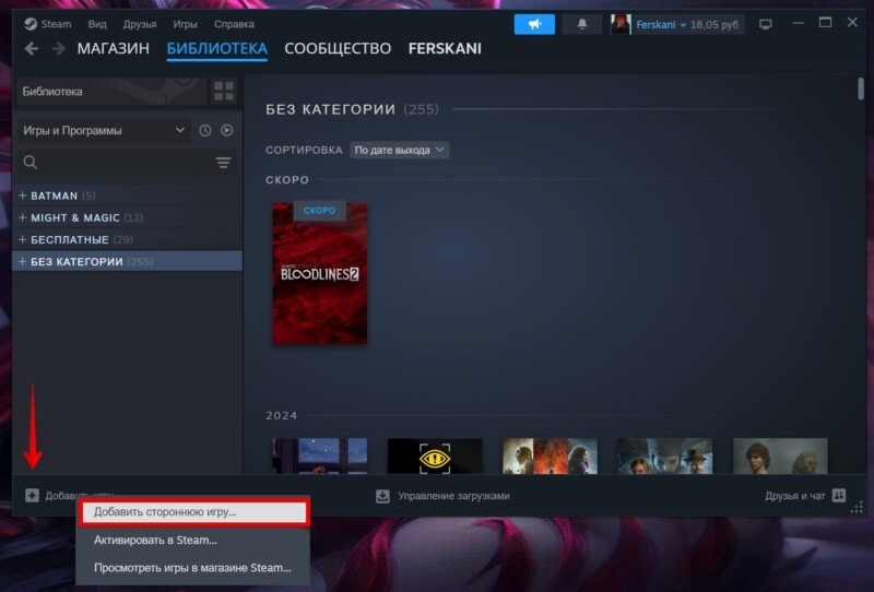 - Добавление в Steam как сторонней игры Steam → «Библиотека» → «Добавить игру» → «Добавить стороннюю игру».