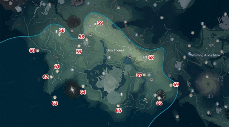• №63: Запад Tacet Field Forbidden Forest — утёс, южная башня (избегайте шипов).