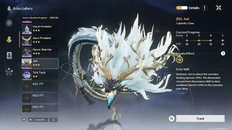 Jue — еженедельный босс, доступный после полного прохождения 7 акта сюжета «Jinzhou Rising». За победу выпадает редкое Эхо класса «Бедствие» (Calamity Class) с Спектро-уроном и баффом на урон от навыка резонанса.
